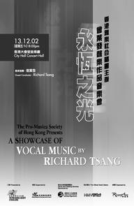 Lux Aeterna is a commission from the Hong Kong Composers' Guild for performance in its 1997 Musicarama. The work is a tone picture of an abstract nature, without any particular literary meanings. The title reflects the composer's emotional affiliation with the music, which, for him, suggests feelings of peace, light, hope and tranquility. Although tonal in nature, the composer has experimented various treatments of dissonance irrespective of the prevailing tonal background. It is also a song without words, in which members of the choir enjoy freedom in the vocalization of the music. Reinforcement during the performance by the organ or piano is also possible.《永恆之光 》是應香港作曲家聯會邀約,為「音樂新文化1997」所創作的歌曲。這首作品富於抽象色彩,本身不具任何特定的文學意義。曲目正好反映了作曲家與作品在情感上的交匯與共鳴;對作曲家來說,《永恆之光 》體現的是和平、光明、期昐和安寧的情懷。雖然這首歌曲屬於調性音樂,但作曲家仍在這種音樂基追調上嘗試融入各種不協和音的元素。此外,《永恆之光 》亦是一首無言之歌,即合唱團成員可以在樂曲的聲樂部分自由發揮。它也可加入管風琴或鋼琴伴奏,以加強音樂效果。